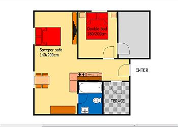 L’appartement Terrace est équipé d’une chambre à coucher et d’une terrasse ainsi que d’une seconde pièce indépendant disposant d’un espace pour dormir. Il peut accueillir jusqu’à 5 personnes (60 m²). La chambre à coucher dispose d’un lit jumeau et la deuxième chambre d’une cuisine bien équipée (four à micro-ondes) et d’un lit jumeau supplémentaire. Salle de bain avec baignoire, douche et toilettes. L’appartement dispose également d’un grand vestiaire équipé d’un coffre-fort.